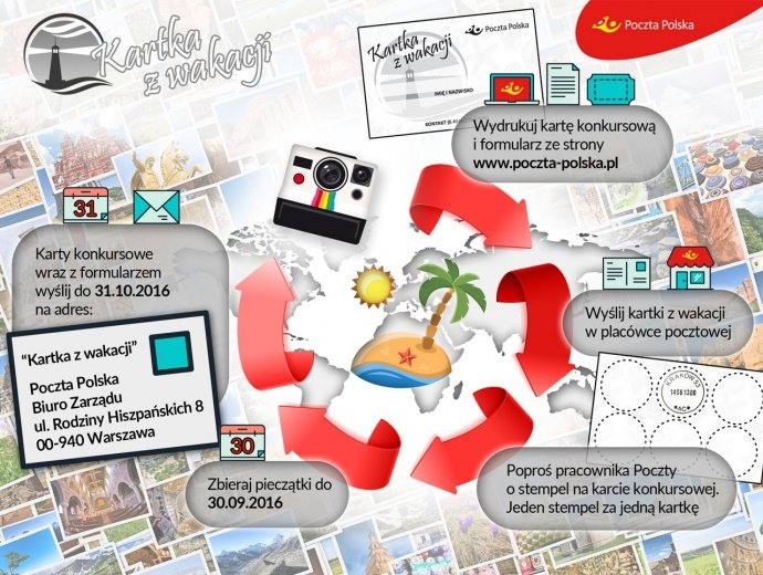 Żeby wziąć udział w konkursie, wystarczy robić to, co i tak zwykle robimy w wakacje – wysyłać kartki z pozdrowieniami do bliskich i przyjaciół! Nadaj kartkę w placówce Poczty Polskiej i poproś pracownika o stempel na karcie konkursowej.