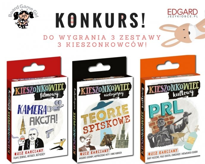 3 zestawy nagród w skład których wchodzą 3 gry wydawnictwa Edgard: Teorie Spiskowe, PRL i Kamera Akcja!