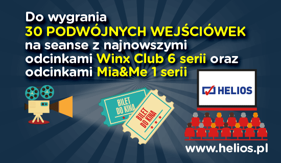 15 podwójnych biletów na wrześniowe seanse do kina Helios z najnowszymi odcinkami Winx Club 6 oraz Mia&Me 1 ufundowane przez firmę Helios Sp. z o.o. o wartości jednostkowej 40 zł brutto.