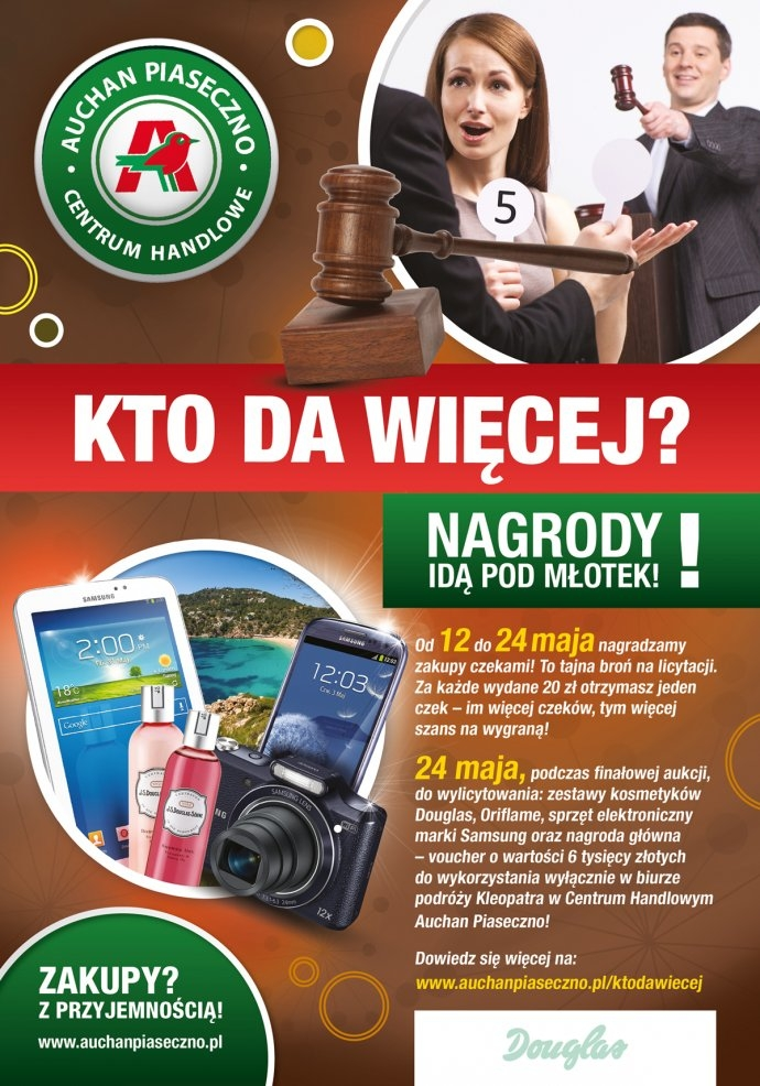 Wielkie urodzinowe licytacje odbędą się w sobotę 24 maja w godzinach 12.00, 14.00 oraz 16.00 w Centrum Handlowym Auchan Piaseczno przy ulicy Puławskiej 46.