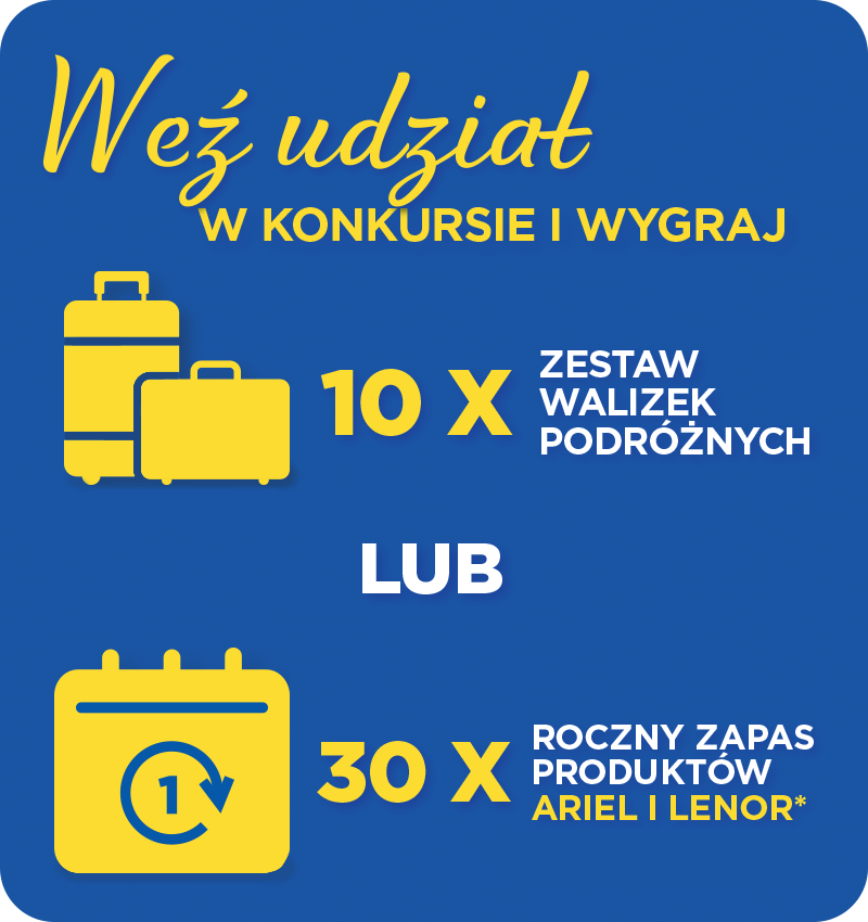 W dn. 01.10-30.11.25r. należy dokonać zakupu dowolnego produktu Ariel z serii Fresh Breeze of Greek Island lub Lenor z serii Fresh Breeze of Greek Island w sklepie Kaufland lub E.Leclerc lub Carrefour lub Auchan i na stronie konkursu opisać co wywołuje u Ciebie najlepsze wakacyjne wspomnienia.