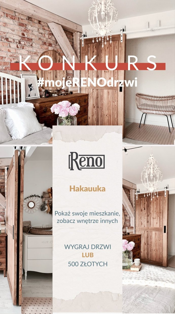 pokazujących wnętrze pokoju Uczestnika w którym ma zamontowane drzwi marki Reno, jeżeli chce wygrać 500zł