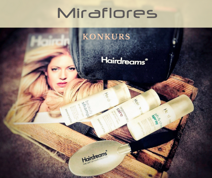 zestaw profesjonalnych kosmetyków do włosów marki Hairdreams, składający się z odżywki nabłyszczającej, odżywki silnie regenerującej, szamponu upiększającego, szczotki oraz cudnej kosmetyczki.