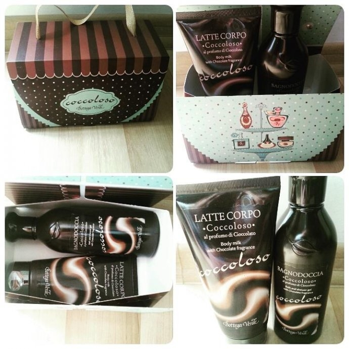 zestaw kosmetyków czekoladowych w ozdobnym opakowaniu: płyn pod prysznic i kąpieli oraz mleczko do ciała.