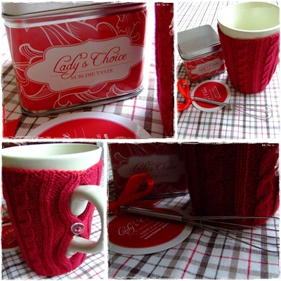 1 miejsce – Duży kubek ubrany w śliczny czerwony sweterek zapinany na guziczek, stylowa puszka