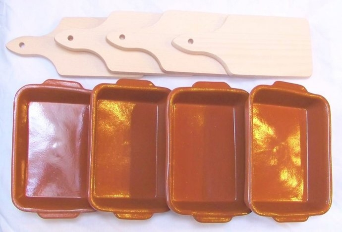zestaw naczyń: zestaw do zapiekanek dla 4 osób (4 x cazuela 18cm band + 4 drewniane deseczki na podkładkę)