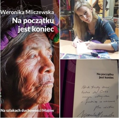 Książka „Na początku jest koniec. Na szlakach duchowości Majów", podpisana przez autorkę, Weronikę Mliczewską.
