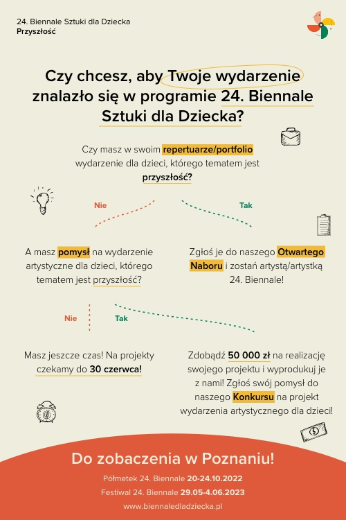 Jeśli masz w swoim repertuarze bądź portfolio wydarzenie dla dzieci w wieku 0-12 lat, które porusza temat przyszłości, zgłoś je do Otwartego Naboru Wydarzeń Artystycznych dla Dzieci i zaprezentuj je podczas 24. Biennale Sztuki dla Dziecka. Do 30 maja przyjmujemy zgłoszenia wydarzeń, których premiera odbyła się nie wcześniej niż 1 marca 2021 r.