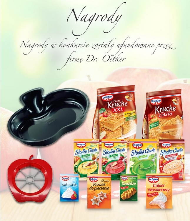 Forma w kształcie jabłka, Krajalnica do jabłek oraz zestaw produktów Dr. Oetkera: Ciasto kruche XXL, Słodka chwila kisiel z kawałkami owoców smak jabłkowo-gruszkowy, Słodka chwila kisiel z kawałkami owoców smak jabłkowo-wiśniowy, Mleczny ryż z kawałkami jabłek i cynamonem, Kisiel smak jabłkowy, Śmietan-fix, Drożdże, Cukier waniliowy, Proszek do pieczenia