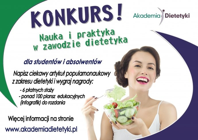 Akademia Dietetyki ogłasza ogólnopolski Konkurs na najciekawszy artykuł popularnonaukowy poświęcony naukom o żywieniu człowieka i dietetyce.