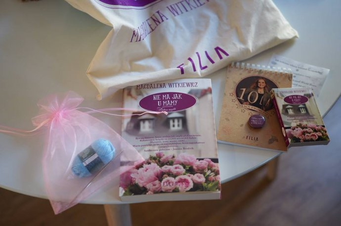 W jednym zestawie znajdziecie oczywiście książkę!!! torbę materiałową z tytułem książki, notesik, włóczkę z szydełkiem, kosmetyk, przypinkę i .... czekoladę!