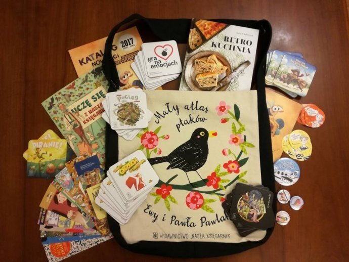 3 zestawy: książka "Retro kuchnia" Anny Włodarczyk + torba z motywami z książki "Mały atlas ptaków" Ewy i Pawła Pawlaków + kolorowe gadżety