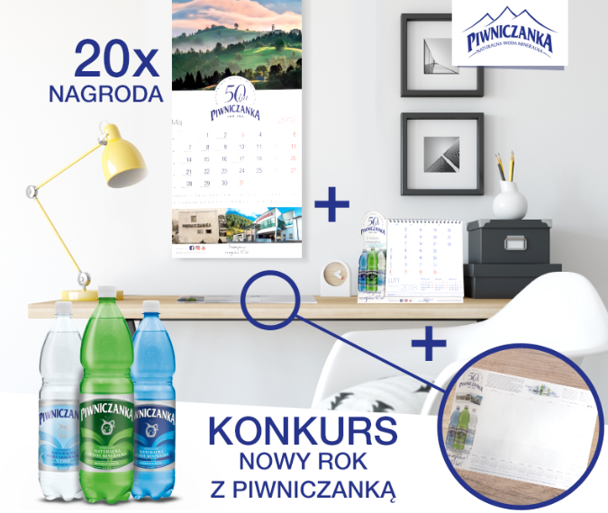 20 nagród rzeczowych w postaci zestawu: kalendarz ścienny, kalendarz na biurko, podkładka na biurko każdy zestaw o wartości 23 zł.