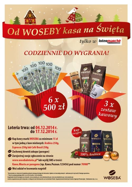 Kup w Intermarché kawy marki Woseba za minimum 15zł w tym jedną z kaw mielonych: Arabica 250g, Espresso 250g lub Café Brasil 250g, zachowaj paragon, zarejestruj swoje zgłoszenie i wygraj!