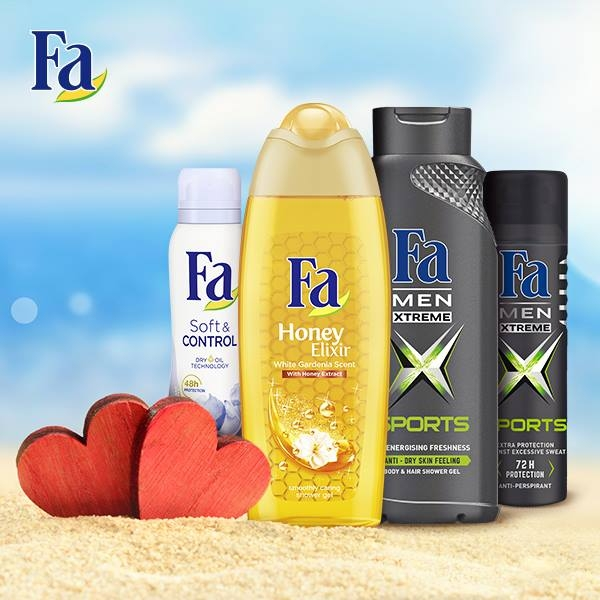 10 zestawów FA składających się z 2 żeli pod prysznic FA, 2 dezodorantów FA oraz wiklinowy koszyk