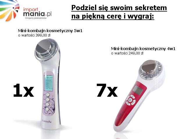 Zapraszamy Cię do wzięcia udziału w konkursie „Piękna cera z Importmanią“, w którym główną nagrodą jest mini-kombajn kosmetyczny 5w1 o rynkowej wartości 399,00 zł. Dzięki niemu, takie zabiegi jak mezoterapia bezigłowa, jonoforeza dodatnia i ujemna, terapia fotonowa czy Bio Wave wykonasz bez wychodzenia z domu!