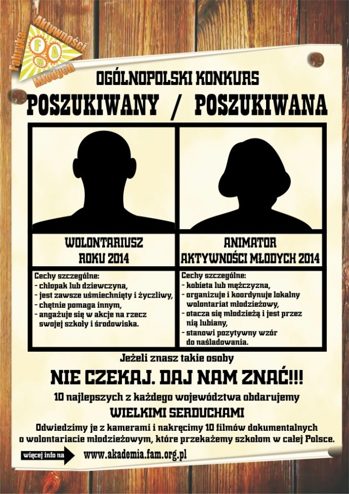 Jeżeli znasz osoby pozytywnie zakręcone na wolontariat, nie zwlekaj i wejdź na stronę www.fam.org.pl w zakładkę „Konkurs Poszukiwany Poszukiwana”, wypełnij prosty formularz i prześlij go do 11 maja na adres: poszukiwany.fam@gmail.com