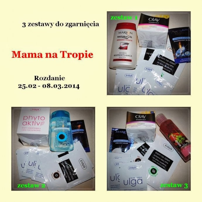 * zestaw 1 - Maska rozświetlająca włosy Marion; krem Olay Essentials na dzień; w saszetkach: Szampon do włosów Diamentowy Blask Marion, 2x krem na dzień Ziaja, 3x krem do cery wrażliwej Ulga Ziaja