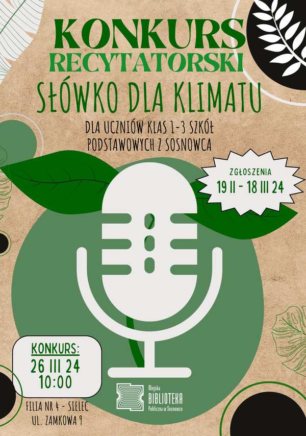 • Karty zgłoszenia uczestników można: przesłać pocztą mailową na adres: f4@biblioteka.sosnowiec.pl do dnia 18 marca 2024 r. z dopiskiem „Słówko dla klimatu”; dostarczyć osobiście do Filii nr 4 - Sielec, Miejskiej Biblioteki Publicznej im. Gustawa Daniłowskiego, ul. Zamkowa 9, 41-200 Sosnowiec, do dnia 18 marca 2024 r.