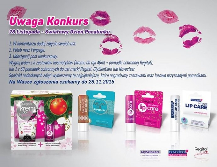 jeden z 5 zestawów kosmetyków (kremu do rąk 40ml + pomadki ochronnej Regital), lub 1 z 30 pomadek ochronnych do ust marki Regital, GlySkinCare lub Novaclear
