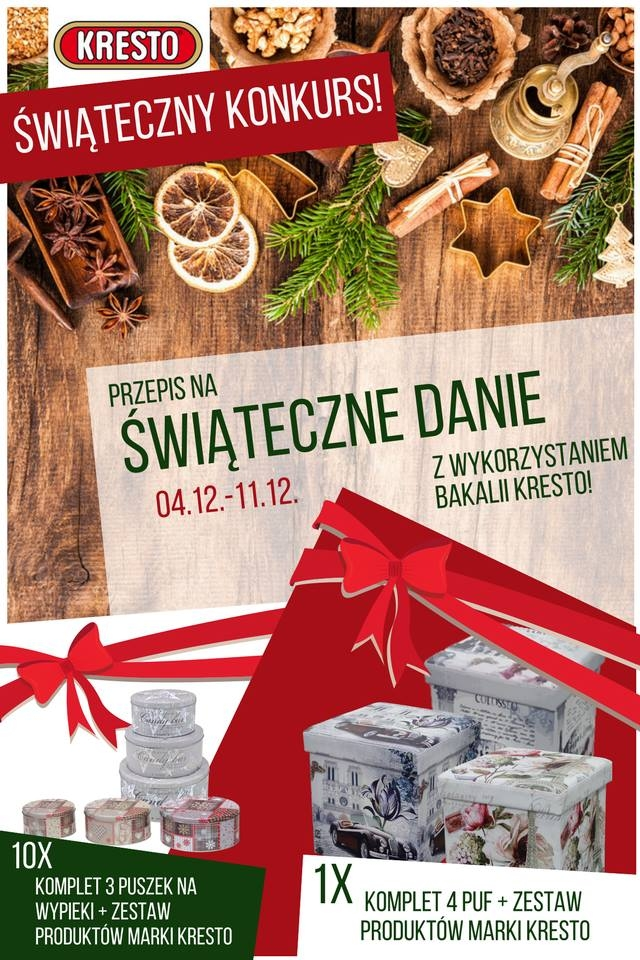 Zadaniem Uczestnika Konkursu jest umieszczenie w komentarzu pod postem konkursowym przepisu na danie świąteczne z wykorzystaniem produktów marek KRESTO.