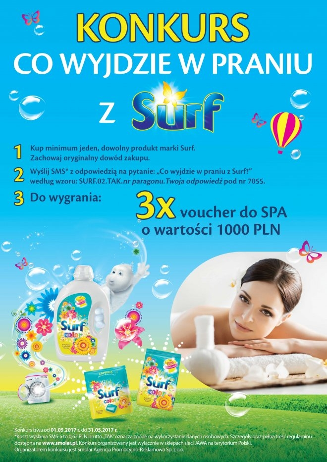 Warunkiem wzięcia udziału w konkursie jest dokonanie zakupu minimum jednego, dowolnego produktu marki Surf, zachowanie paragonu, a następnie wysłanie pod numer 7055 SMS-a jak najciekawszej odpowiedzi na pytanie "Co wyjdzie w praniu z Surf?". Treść SMS-a powinna mieć następujący schemat: SURF.02.TAK.NR PARAGONU.TWOJA ODPOWIEDŹ.