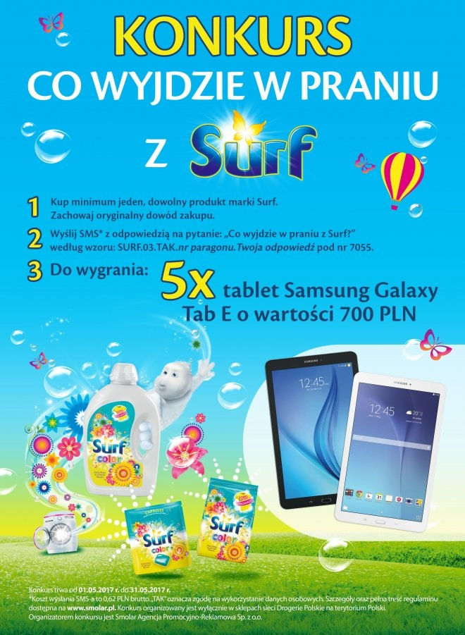 Warunkiem wzięcia udziału w konkursie jest dokonanie zakupu minimum jednego, dowolnego produktu marki Surf, zachowanie paragonu, a następnie wysłanie pod numer 7055 SMS-a jak najciekawszej odpowiedzi na pytanie "Co wyjdzie w praniu z Surf?". Treść SMS-a powinna mieć następujący schemat: SURF.03.TAK.NR PARAGONU.TWOJA ODPOWIEDŹ.