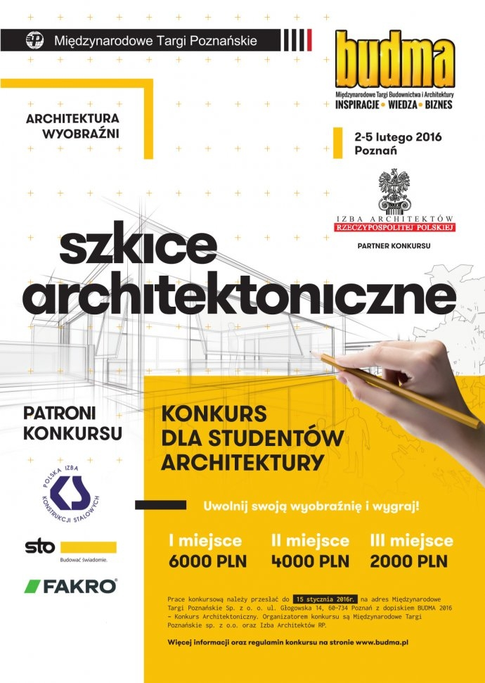 „Szkice architektoniczne” to ogólnopolski konkurs skierowany do studentów szkół architektonicznych (publicznych i prywatnych) na terenie kraju, nadających tytuły inżyniera architekta lub magistra inżyniera architekta. Uczestnicy konkursu mają za zadanie przygotować rysunek odręczny w formacie A2, wykonany techniką tradycyjną (ołówkiem, rapidografem, piórem, markerem czy kredką). W tym roku organizatorzy przewidzieli możliwość zastosowanie nie więcej niż trzech kolorów. Konkurs ma na celu umożliwienie studentom zaprezentowania swoich umiejętności artystycznych, niezbędnych w zawodzie architekta, przedstawienia zapisu własnych emocji, swojej wizji zastosowania materiałów w architekturze. Nad przebiegiem konkursu czuwa specjalne jury konkursowe złożone z czołowych polskich architektów, grafików oraz artystów plastyków. Jury wyróżni 10 prac, a trzy najlepsze zostaną uhonorowane nagrodami finansowymi. Uroczyste rozstrzygnięcie konkursu odbędzie się podczas najbliższej edycji targow BUDMA (2-5 lutego 2016 r.).