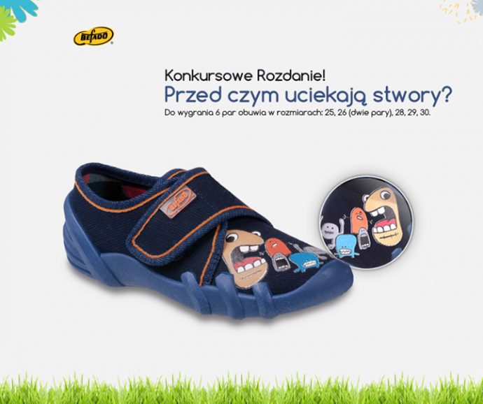 Zadanie jest proste – musicie napisać nam przed czym uciekają stwory, które widać na bucikach. O pomoc w tym trudnym zadaniu najlepiej poproście Wasze pociechy:) Najbardziej kreatywne odpowiedzi nagrodzimy tymi właśnie butami. Nie zapomnijcie w komentarzu wpisać rozmiaru, który Was interesuje!