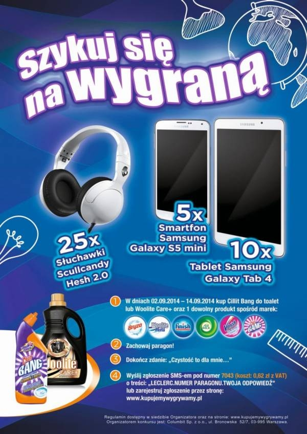 a) Nagroda pierwszego stopnia: w ilości 5 (słownie: pięciu) sztuk – Smartfon Samsung Galaxy S5 mini o wartości jednostkowej 1 700,00 zł brutto (słownie: jeden tysiąc siedemset złotych 00/100), wraz z dodatkową nagrodą pieniężną w wysokości 189zł brutto (słownie: sto osiemdziesiąt dziewięć złotych). Łączna wartość pojedynczej nagrody głównej to 1 889,00 zł (słownie: tysiąc osiemset osiemdziesiąt dziewięć złotych).