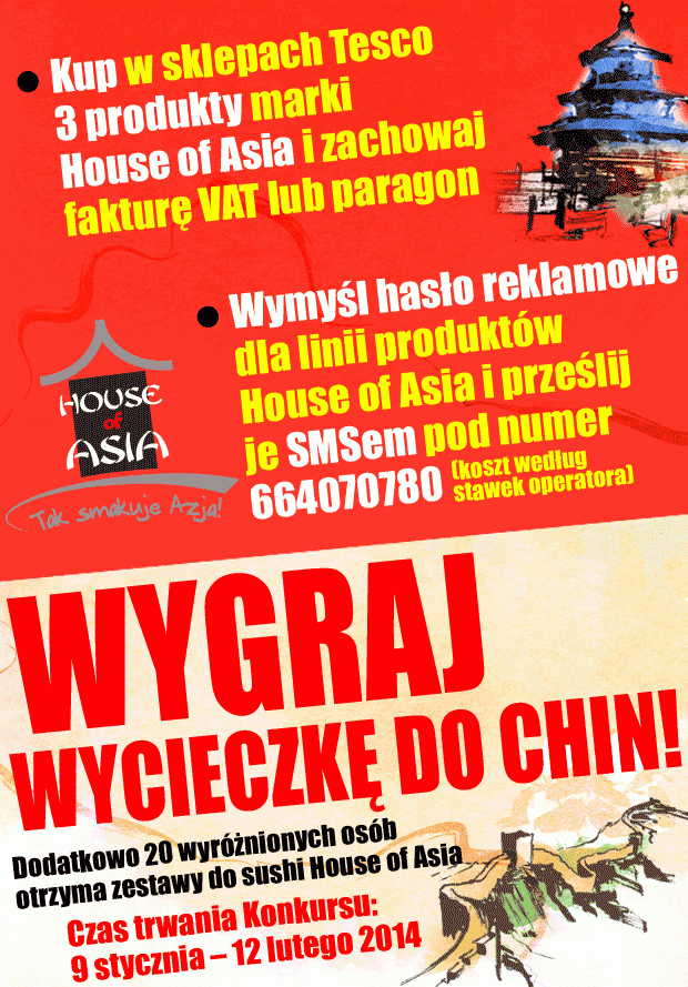 - wysyłać SMS pod numer 664070780 ze stworzonym przez siebie oryginalnym hasłem reklamowym dla linii produktów House of Asia.