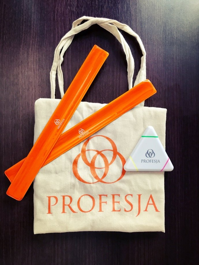 gadżety Profesja CAZ SP. Z. O.O. (torba, odblaskowa opaska samozaciskowe oraz kolorowy zakreślacz 3w1).