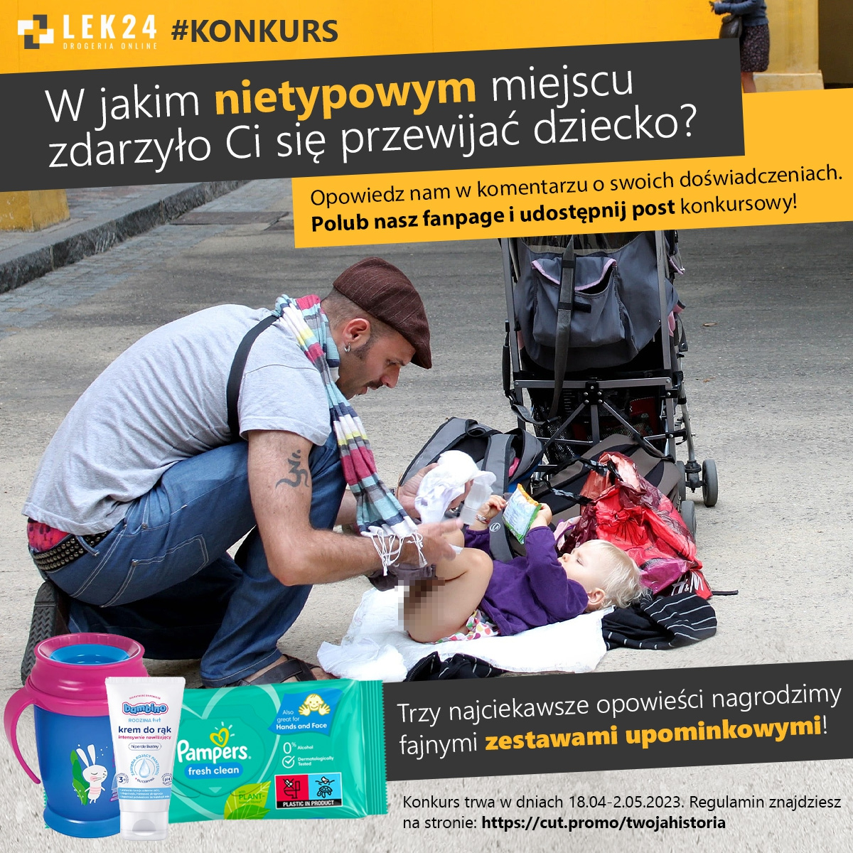 Należy w komentarzu pod postem konkursowym opisać... "w jakim nietypowym miejscu zdarzyło Ci się przewijać dziecko". Żeby nie było aż tak prosto, do kompletu trzeba polubić post konkursowy i udostępnić na swoim profilu link do naszego fanpage'a