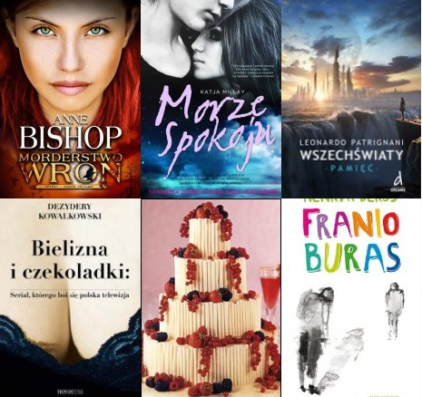 egzemplarze książek: "Morderstwo wron" Anne Bishop, "Morze spokoju" Katji Millay, "Wszechświaty. Pamięć" Leonardo Patrignani "Bielizna i czekoladki. Serial, którego boi się polska telewizja" "Franio Buras"