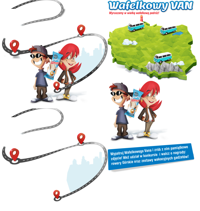3 rowery marki Kross oraz 3 zestawy gadżetów wakacyjnych w tym: bidon, smyczka, czapeczka, 30szt wafelków Góralki; wybiera Komisja Konkursowa.