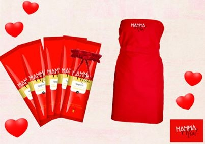 3 walentynkowe zestawy Mamma Mia! - w każdym znajdziesz 5 makaronów spaghetti, czerwony fartuszek oraz czerwoną... podwiązkę!