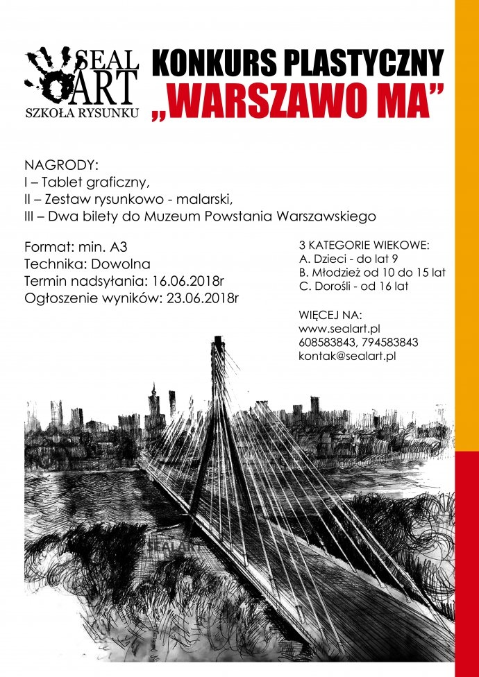 SealArt szkoła rysunku w Warszawie zaprasza dużych i małych artystów z instytucji oświatowych oraz ośrodków i szkół artystycznych do udziału w Konkursie Plastycznym ,,Warszawo ma” Konkurs został podzielony na 3 kategorie wiekowe. Wśród nagród dla uczestników znajdą się tablet graficzny, zestaw do rysowania oraz bilety do Muzeum Powstania Warszawskiego. To, co najbardziej skłania artystów do udziału w konkursie to jego formuła, która stwarza nieograniczone pole dla inwencji twórczej uczestników.