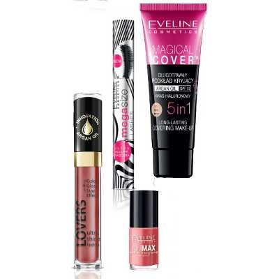 trzy zestawy kolorowych kosmetyków firmy EVELINE