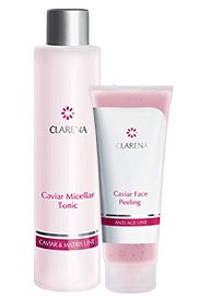 3 zestawy kosmetyków Clarena zapakowane w firmową kosmetyczkę : kawiorowy tonik micelarny (Clarena Micellar Tonic) oraz kawiorowy peeling do twarzy (Clarena Caviar Face Peeling).