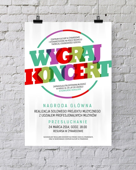 Centrum Kultury w Żyrardowie zaprasza wokalistów w wieku 16 – 25 lat do udziału w konkursie wokalnym "Wygraj koncert". Festiwal konkursowy odbędzie się 24 marca w Resursie. Wykonawcy będą mieli za zadanie zaprezentować jedną piosenkę z akompaniamentem instrumentu, acapella bądź z towarzyszeniem podkładu muzycznego. Zwycięzca konkursu zaproszony zostanie do udziału w projekcie koncertowym Centrum Kultury.
