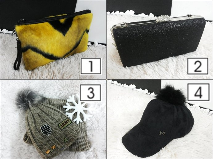 jedna z nagród: zimowa torebka, sylwestrowa kopertówka, zestaw: czapka + szalik, lub czapka z daszkiem i pomponem