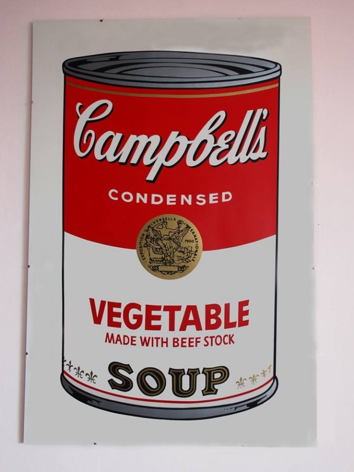 obraz "Puszki zupy firmy Campbell" drukowany technologią UV, bezpośrednio na szkle o wymiarach 50x70 cm