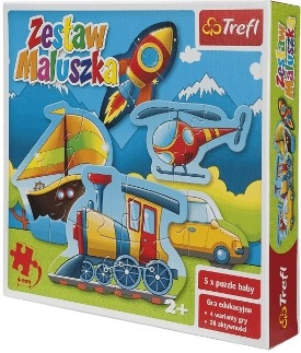 5x "Zestaw Maluszka" marki Trefl, czyli puzzle i gra edukacyjna w jednym. Zestawy występują w kilku wariantach (pojazdy, zwierzęta, dinozaury)