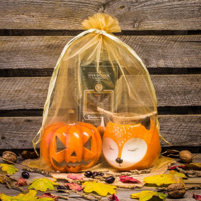 Kubek z motywem lisa, świecznik w kształcie dyni, zaparzacz, korzenna herbata, woreczek z organzy