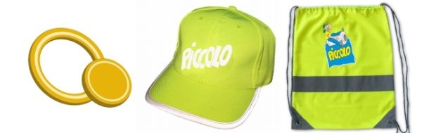 4 odblaskowe zestawy Piccolo z opaską, czapką i workiem typu plecak oraz 6 butelek Piccolo z odblaskową opaską.