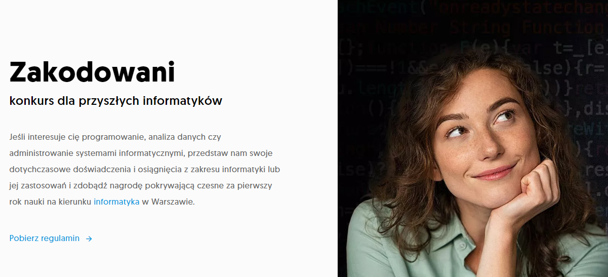 Zakodowani to dwuetapowy konkurs, którego ideą jest wsparcie utalentowanych kandydatów na studia informatyczne. Dzięki pomocy materialnej 16 pasjonatów otrzyma stypendia pokrywające czesne za pierwszy rok nauki na kierunku informatyka w Warszawie.