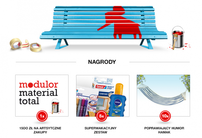Zgłaszanie udziału w Konkursie poprzez ściągnięcie udostępnionego szablonu z projektem ławki, pomalowanie projektu i odesłanie go za pomocą aplikacji dostępnej w profilu "Kobieta Kreatywna". Prace są moderowane przez administratorów aplikacji konkursowej.