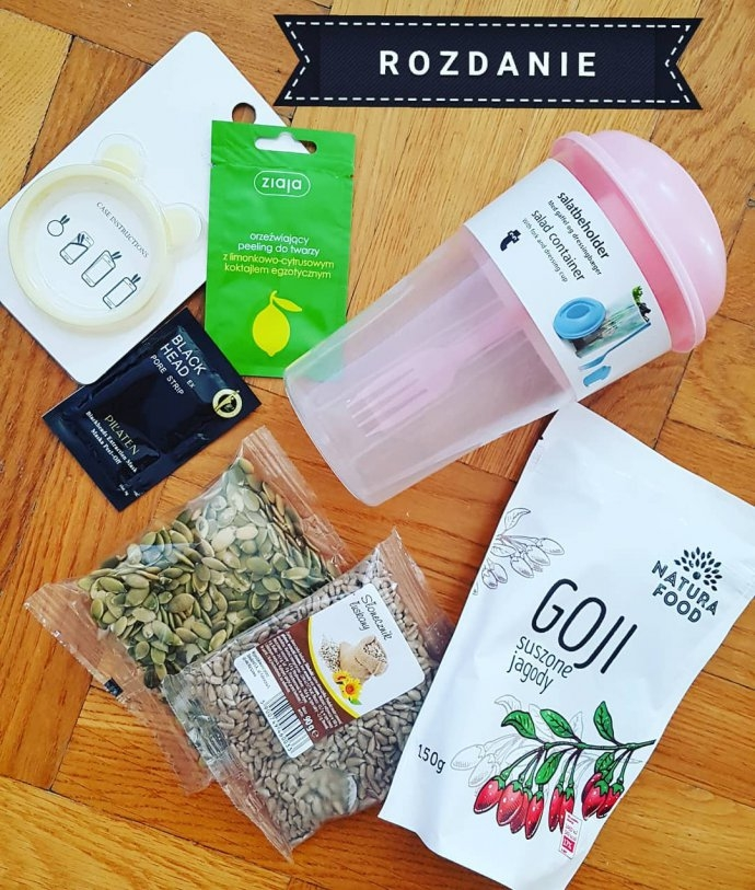Pojemnik na sałatkę, jagody goji, nasiona słonecznika i dyni, maska Pilaten, peeling, etui do telefonu