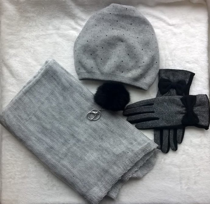 zestaw zimowy: czapka, szal, rękawiczki i pluszowy breloczek