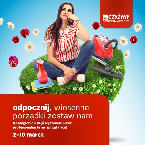 W dniach od 2 do 10 marca 2018 roku klienci CH Czyżyny mogą wziąć udział w konkursie pod hasłem: „Odpocznij, wiosenne porządki zostaw nam”. Aby zdobyć szansę na wygranie wybranej usługi sprzątania należy w czasie trwania akcji zrobić zakupy za min. 50 zł w sklepach lub punktach handlowych i usługowych na terenie Centrum Handlowego Czyżyny (można łączyć maksymalnie 2 paragony) oraz wypełnić kupon konkursowy. Uczestnik konkursu powinien zaznaczyć na formularzu rodzaj nagrody, którą chciałby wygrać oraz odpowiedzieć na pytanie: „Co innego wolałbym robić zamiast sprzątania?”.